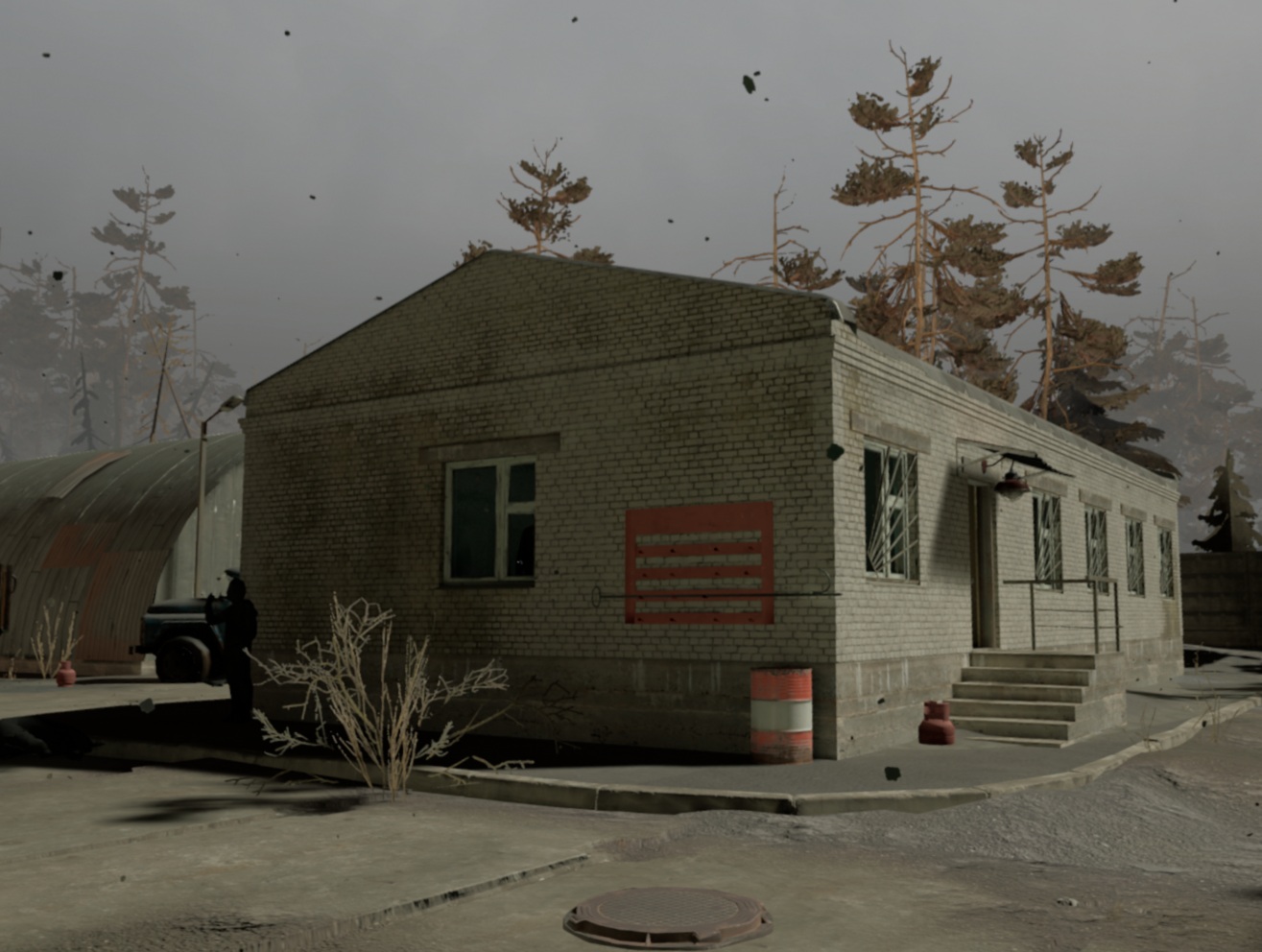 倉庫の反対側にある長方形の建物が目的のブツが置いてある事務所です。