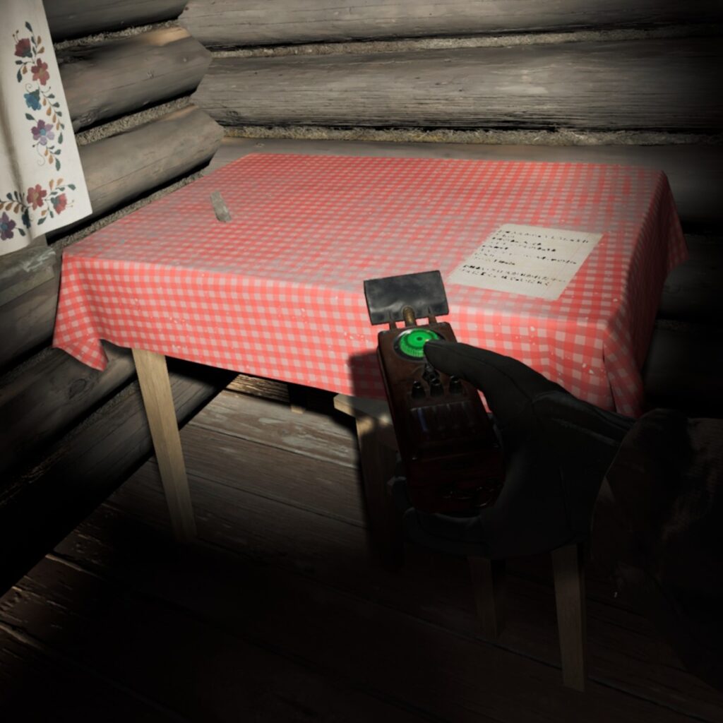 家の中にはテーブルクロスがかかった机があり、そのそばには紙のメモが置いてあります。